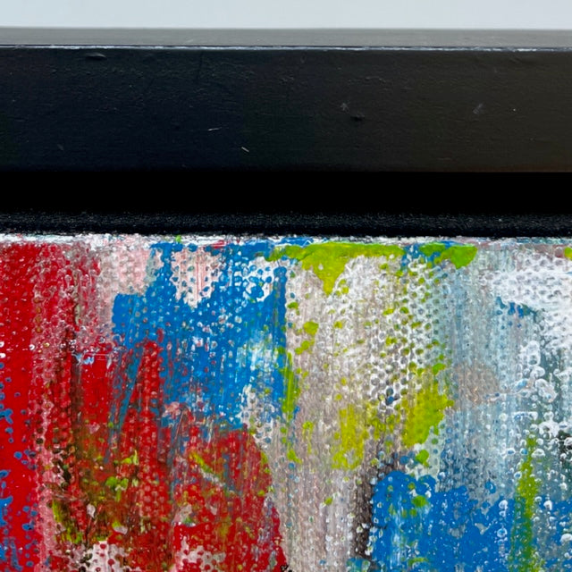On of two in a series inspired by my son to "paint something without pink", this textured acrylic abstract on stretched canvas features cobalt blue, red, lime green, black and white.