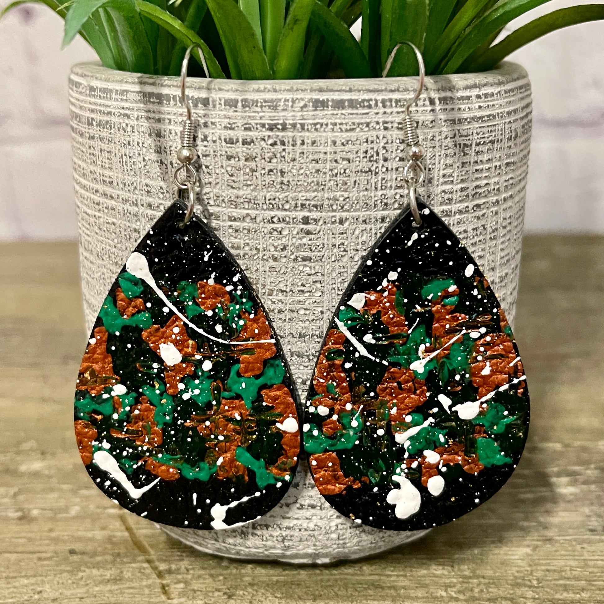 Black teardrop shape with a unique design using forest green, bright green and bronze with white splatters. These earrings are giving off some camo vibes.