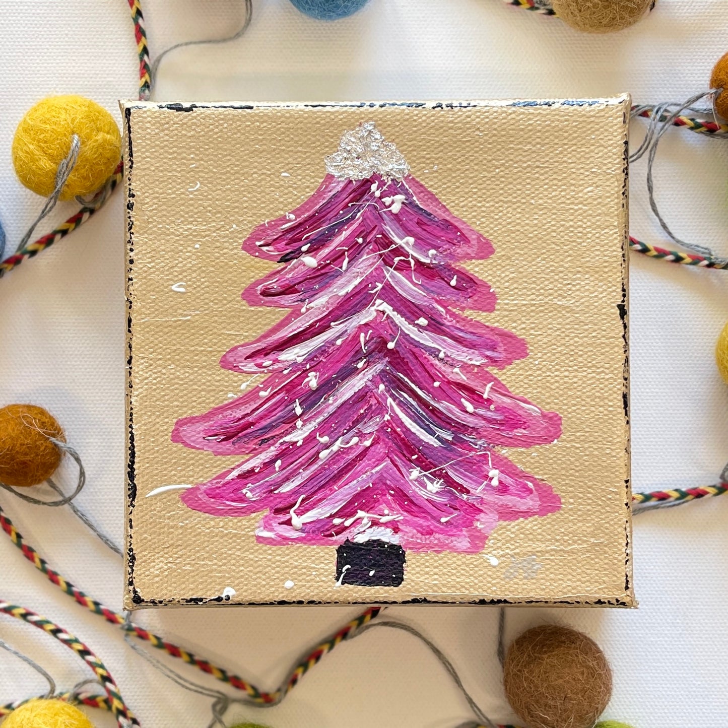 Add a touch of holiday style to your home or office with this pink Christmas tree set on a metallic gold background with metallic leaf to top it off. These little guys also make thoughtful gifts!