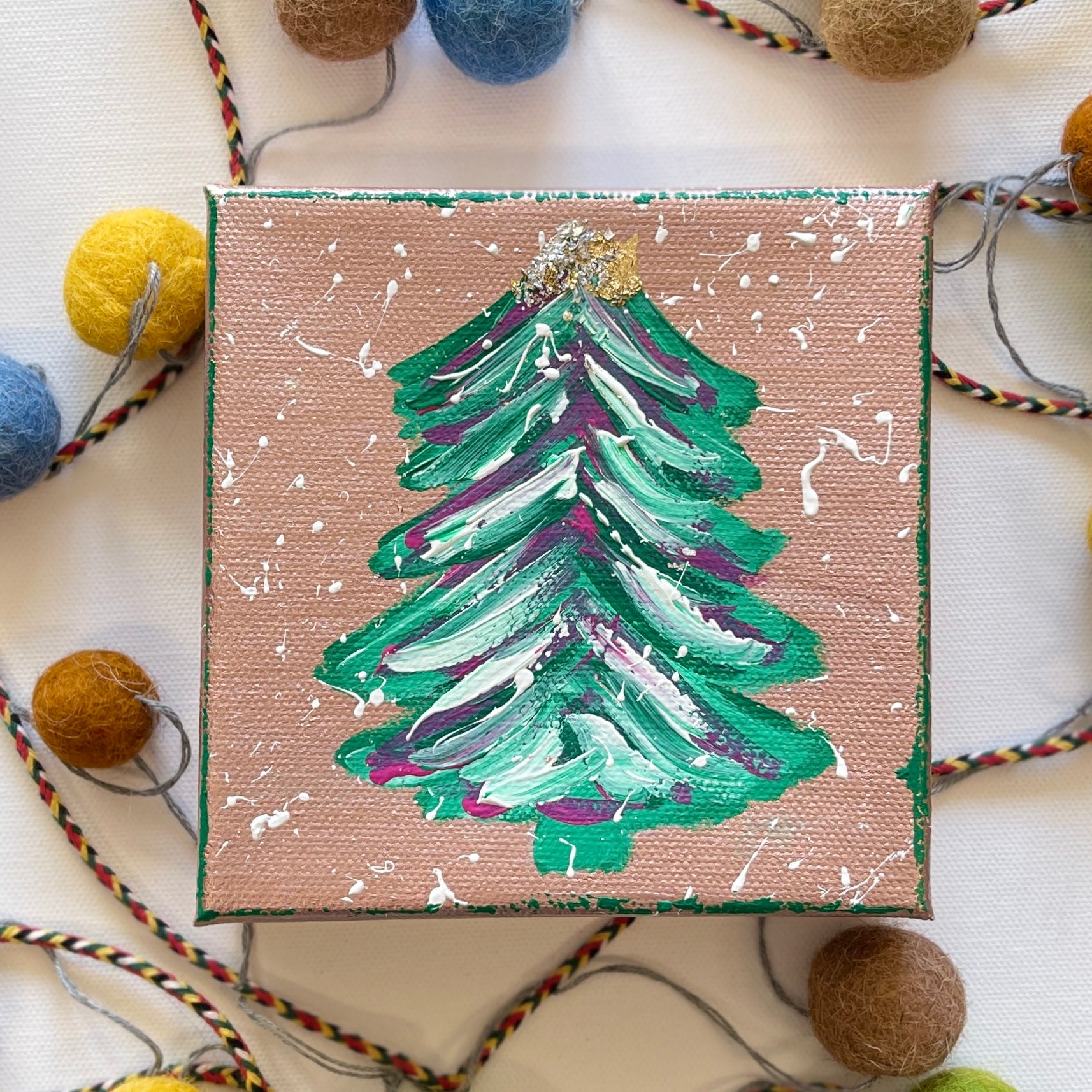 Add a touch of holiday style to your home or office with this pink and green Christmas tree set on a metallic rose gold background with metallic leaf to top it off. These little guys also make thoughtful gifts!