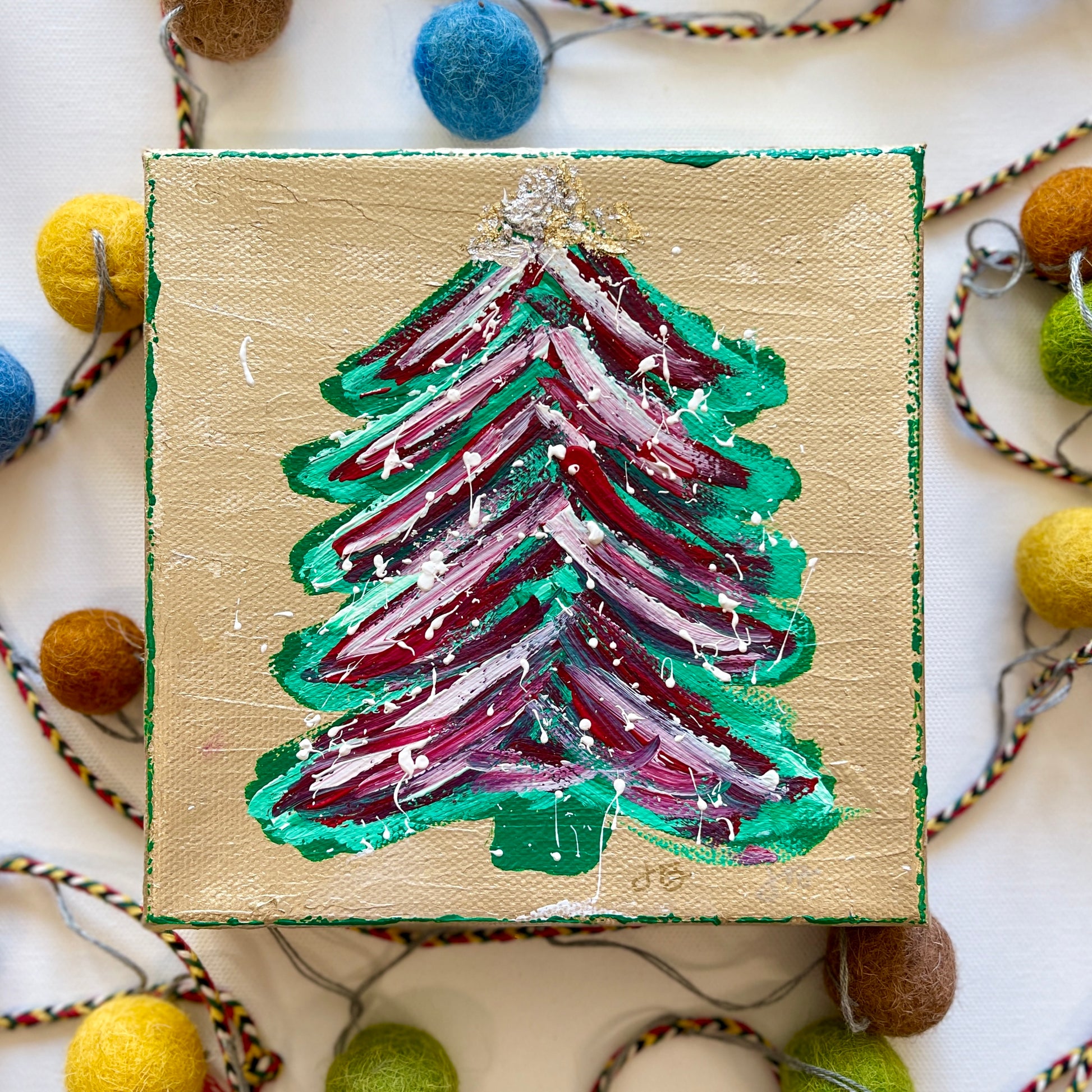 Add a touch of holiday style to your home or office with this green and red Christmas tree set on a metallic gold background with metallic leaf to top it off. These little guys also make thoughtful gifts!