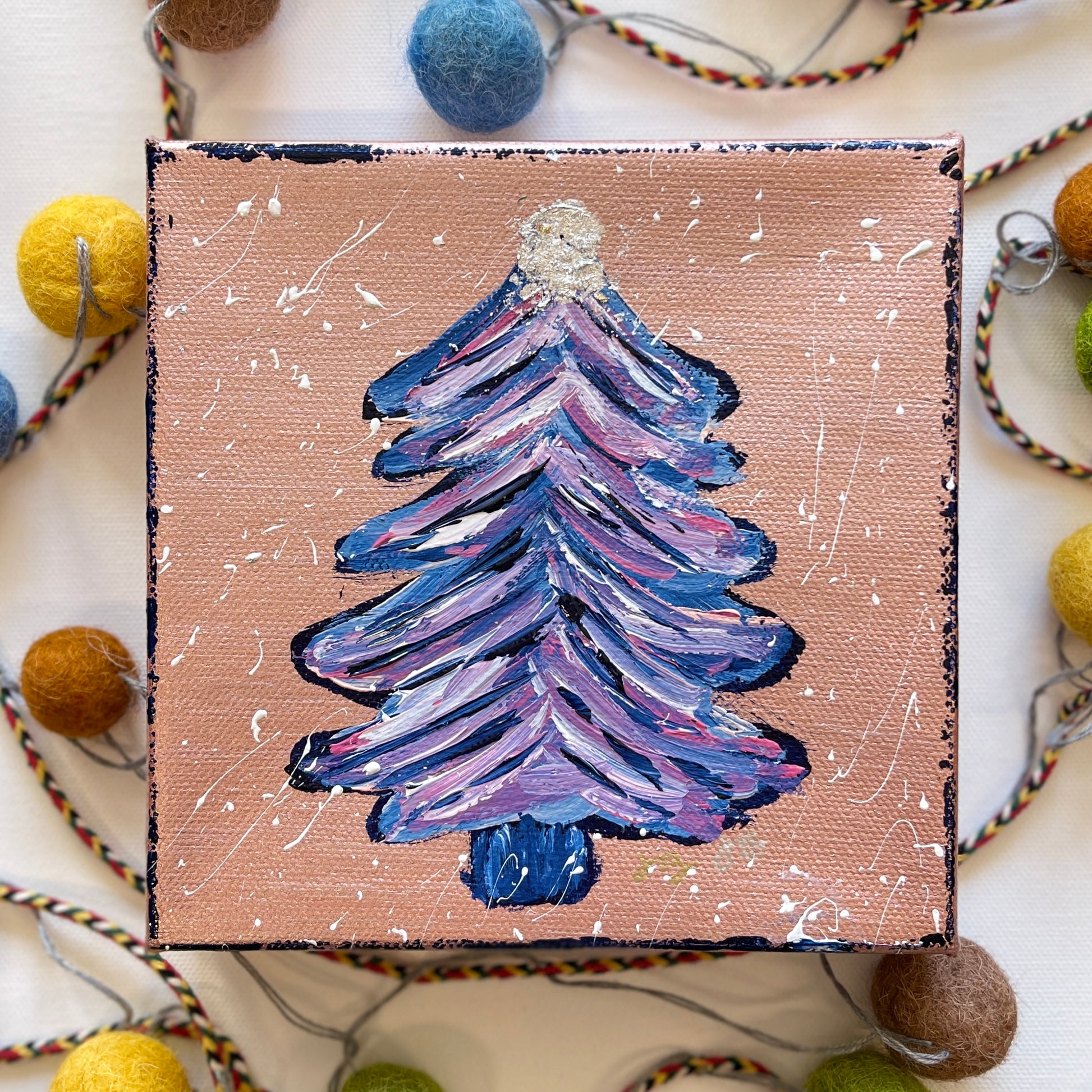 Add a touch of holiday style to your home or office with this blue and pink Christmas tree set on a metallic rose gold background. These little guys also make thoughtful gifts!