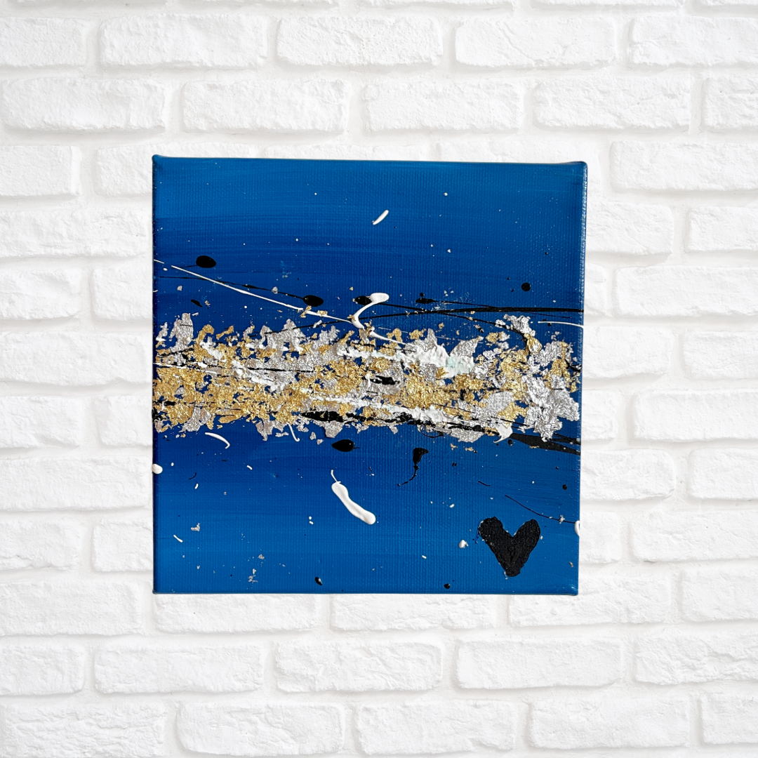 A blended blue background with gold and silver leaf lining the center and white and black splatters. The piece is finished with a black heart in the lower right corner to remind you that you are loved unconditionally.