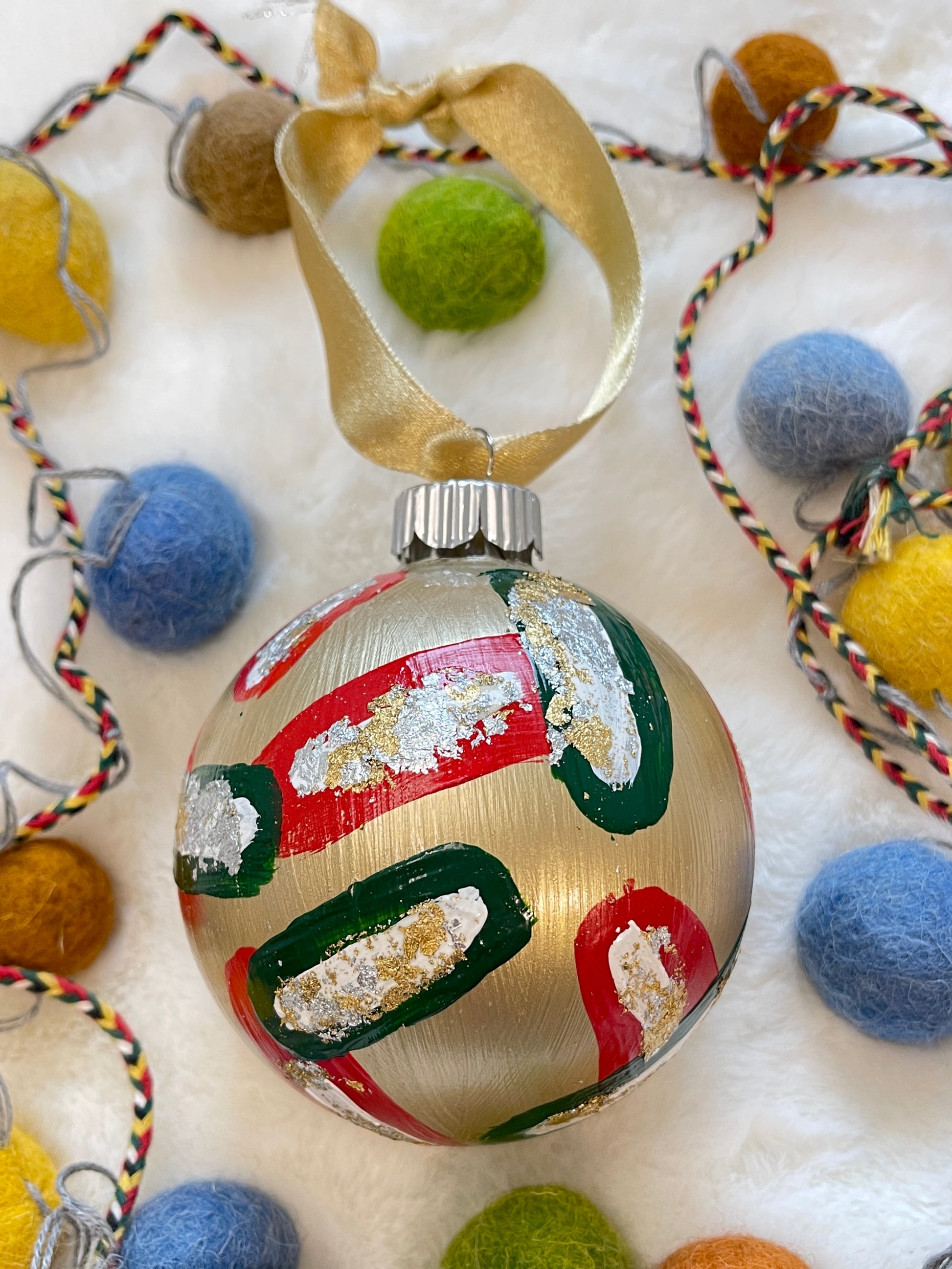 Whimsical stripes in traditional red, white and green on a champagne background accented with gold leaf. Perfect for gifting and collecting.