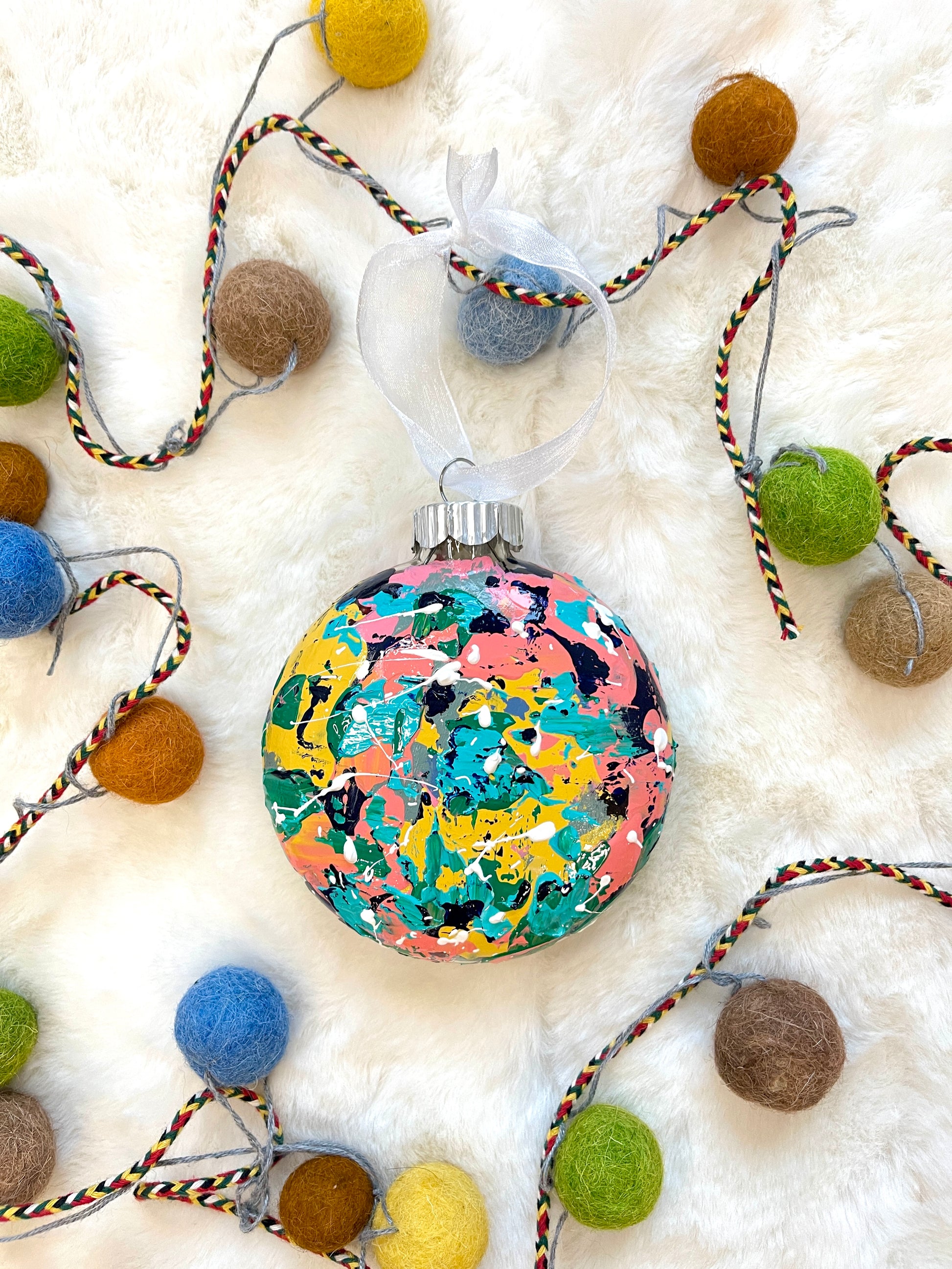 Signature colorful abstract design with whimsical white splatters.