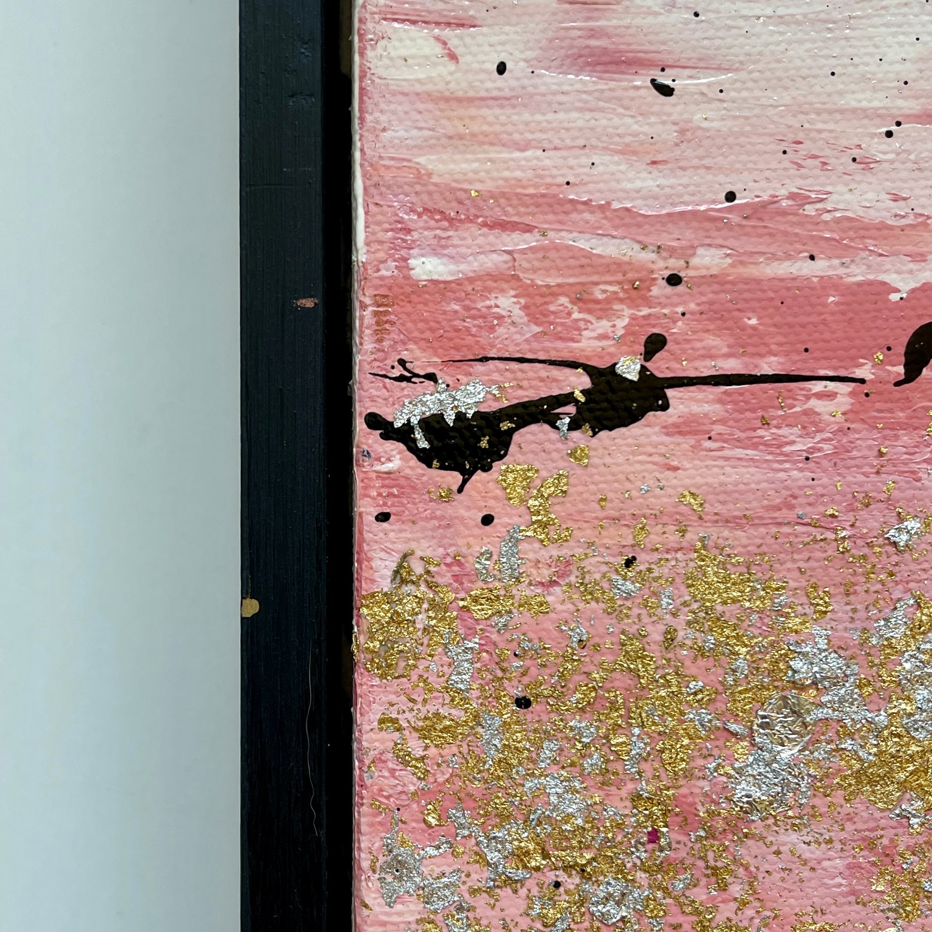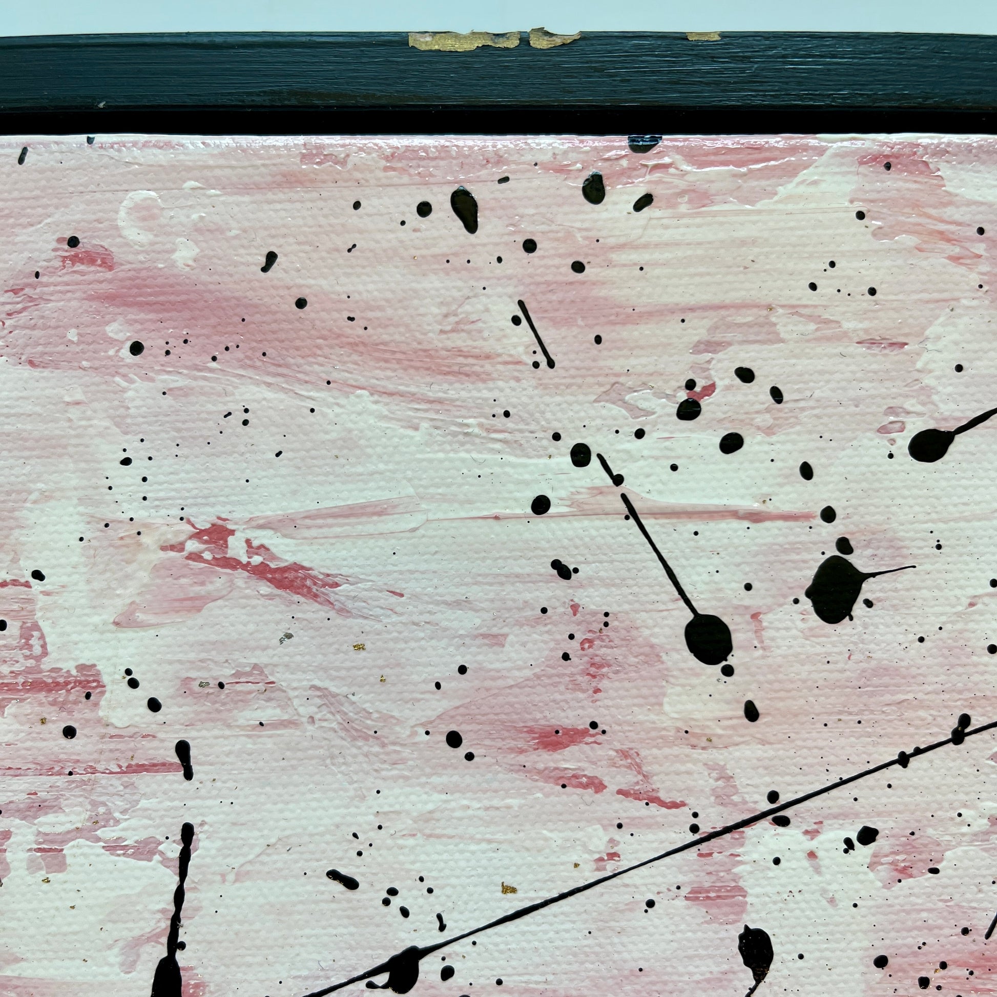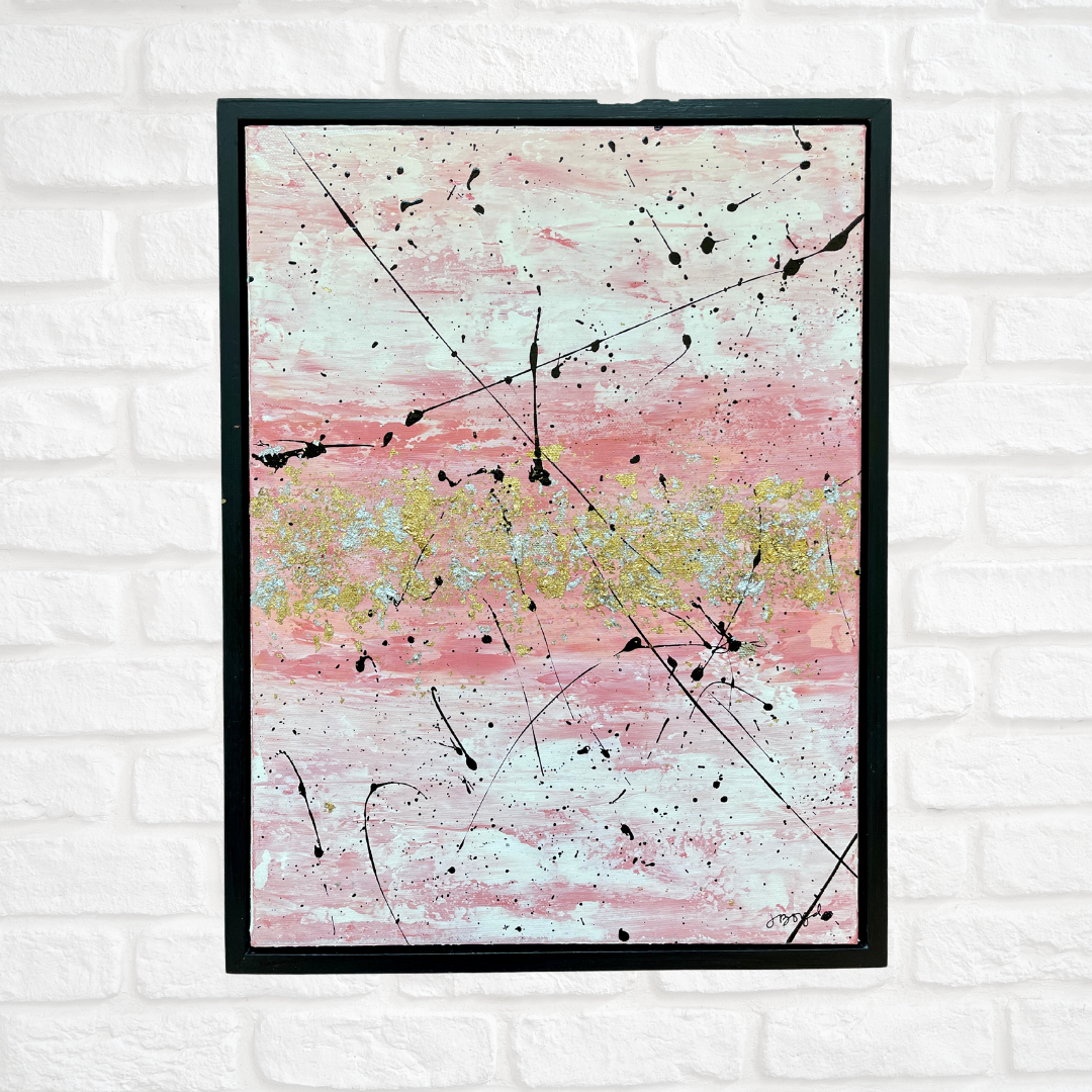 Pink and white blend together to create a backdrop for gold and silver leaf flakes. It all comes together with black splatters, (because life can be messy).