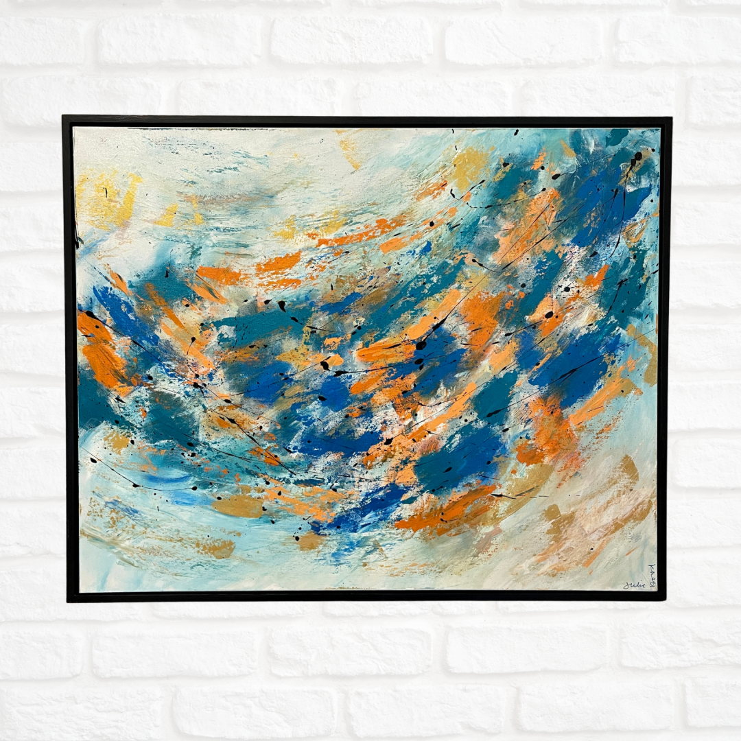 Metallic shades of blue, teal, orange, gold and black move together to remind us that no matter what you see in front of you, it's always better to focus on the positive.